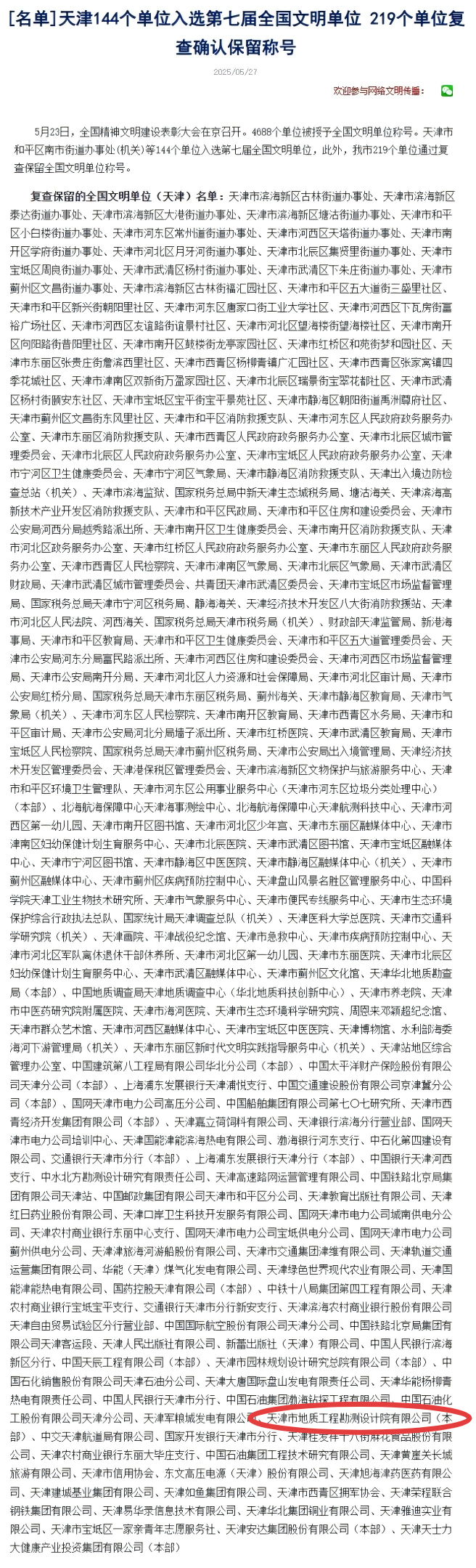 喜報(bào)!天津市地質(zhì)工程勘測設(shè)計(jì)院有限公司 順利通過全國文明單位復(fù)查確認(rèn)